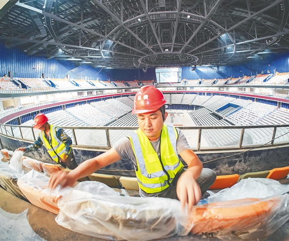 10月29日,在海口五源河體育館,工作人員在為已安裝完畢的觀眾座椅套上防塵保護膜。該項目已進入收尾施工階段。該館有1.8萬個觀眾座席。建成后,將與五源河體育場形成片區體育賽事中心,進一步增強海口舉辦國際、國內大賽的能力。